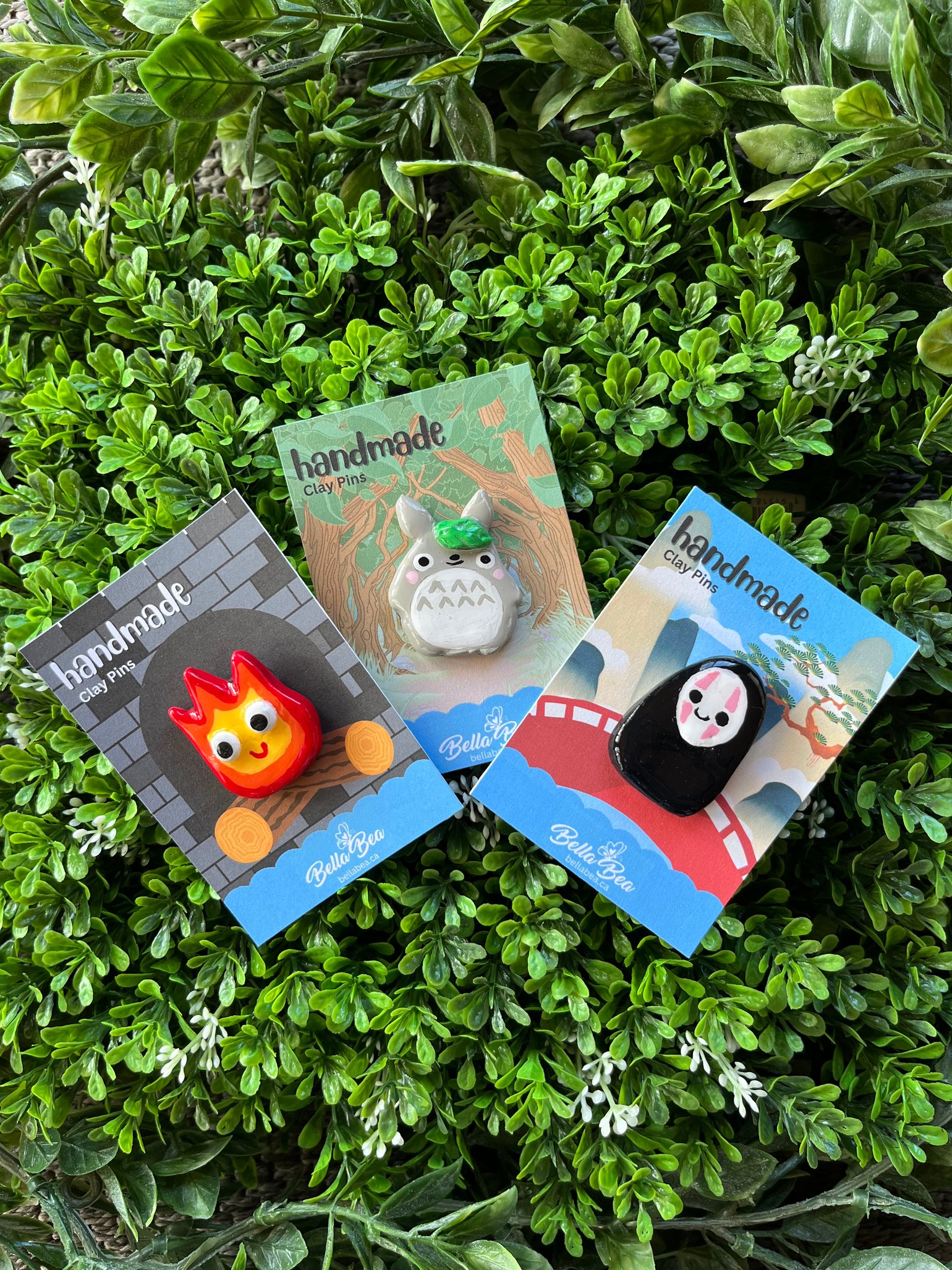 - Sizes: Calcifer approx 1.25"wide x 2" high, Totoro approx 1.5" wide x 1.5" high, No Face approx 1" wide x 1.5" high Soot Sprites approx 1" in diameter. (Please note that the size of the pins may vary since they are all individually molded.)